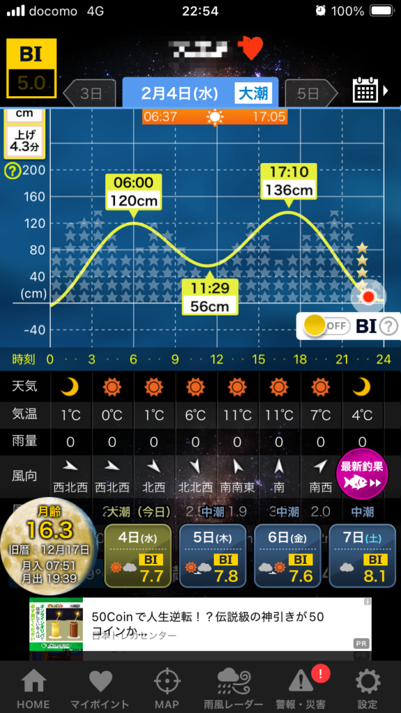 大潮干潮からの中潮上げって感じ。よく流れて釣れそうな気がします。月も明るいけど雲で陰って良い感じです。