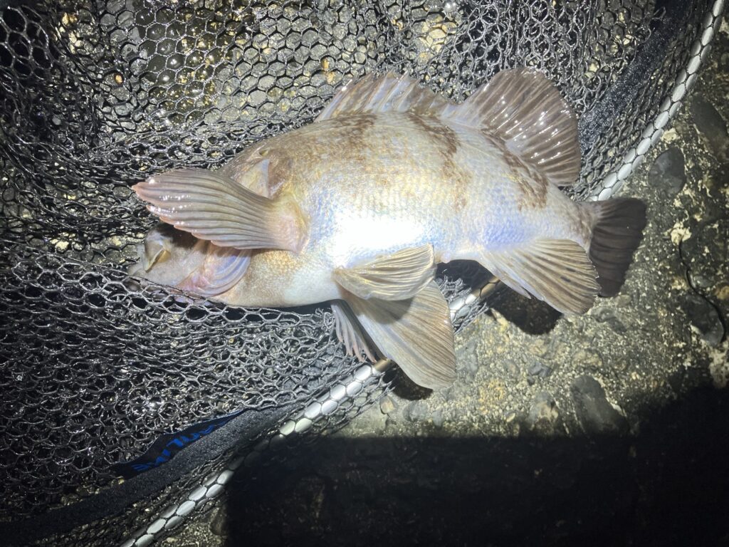 0:03、これも20cm代後半、26cm位だと思います。アジングロッドで抜くのが怖くて、タモを使いました。
